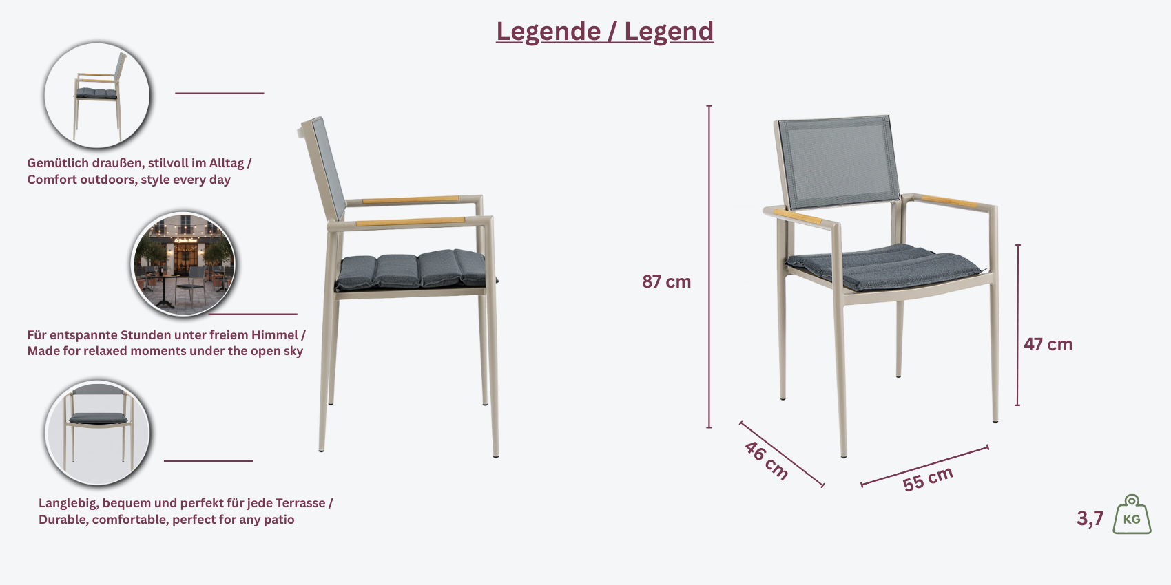 - Elegantes Erscheinungsbild: Der Stuhl Kronos besticht durch seine moderne Farbgebung in Greige und Anthrazit, die sich harmonisch in jede Outdoor-Umgebung einfügt – ideal für Terrassen, Gärten und Balkone.