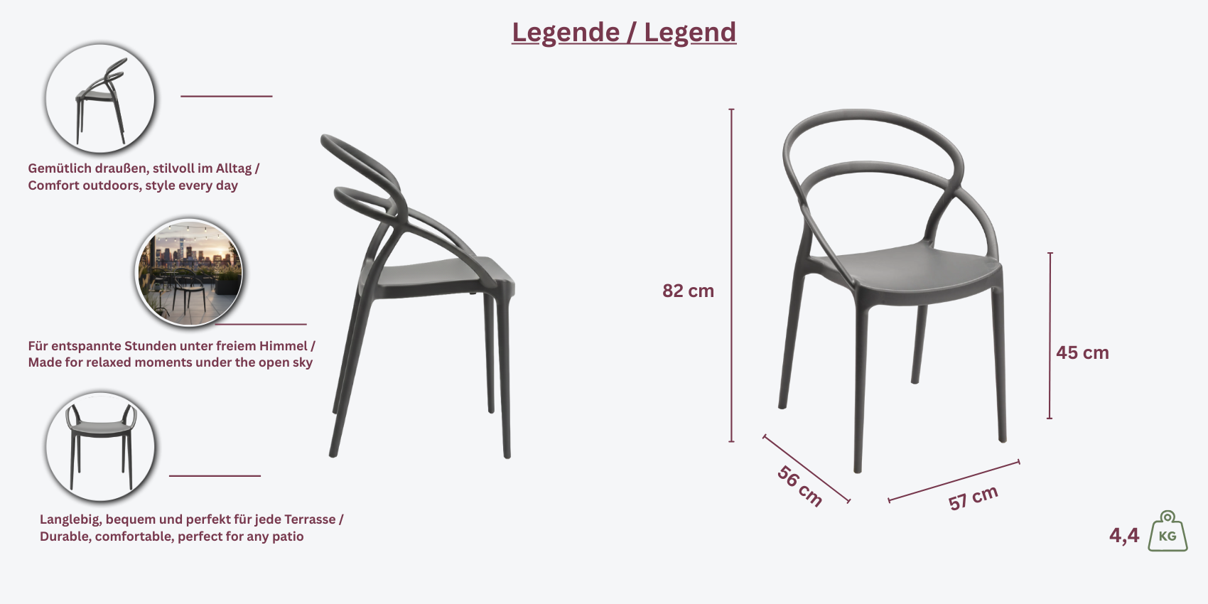 Der Lena Stapelstuhl kombiniert modernes Design mit funktionaler Vielseitigkeit und ist die ideale Wahl f jeden Aunbereich. Mit seinem eleganten Erscheinungsbild und der zeitlosen thetik ft sich dieser Stuhl nahtlos in jede Terrasse, jeden Garten oder Balkon ein und sorgt f eine stilvolle Atmosphe.