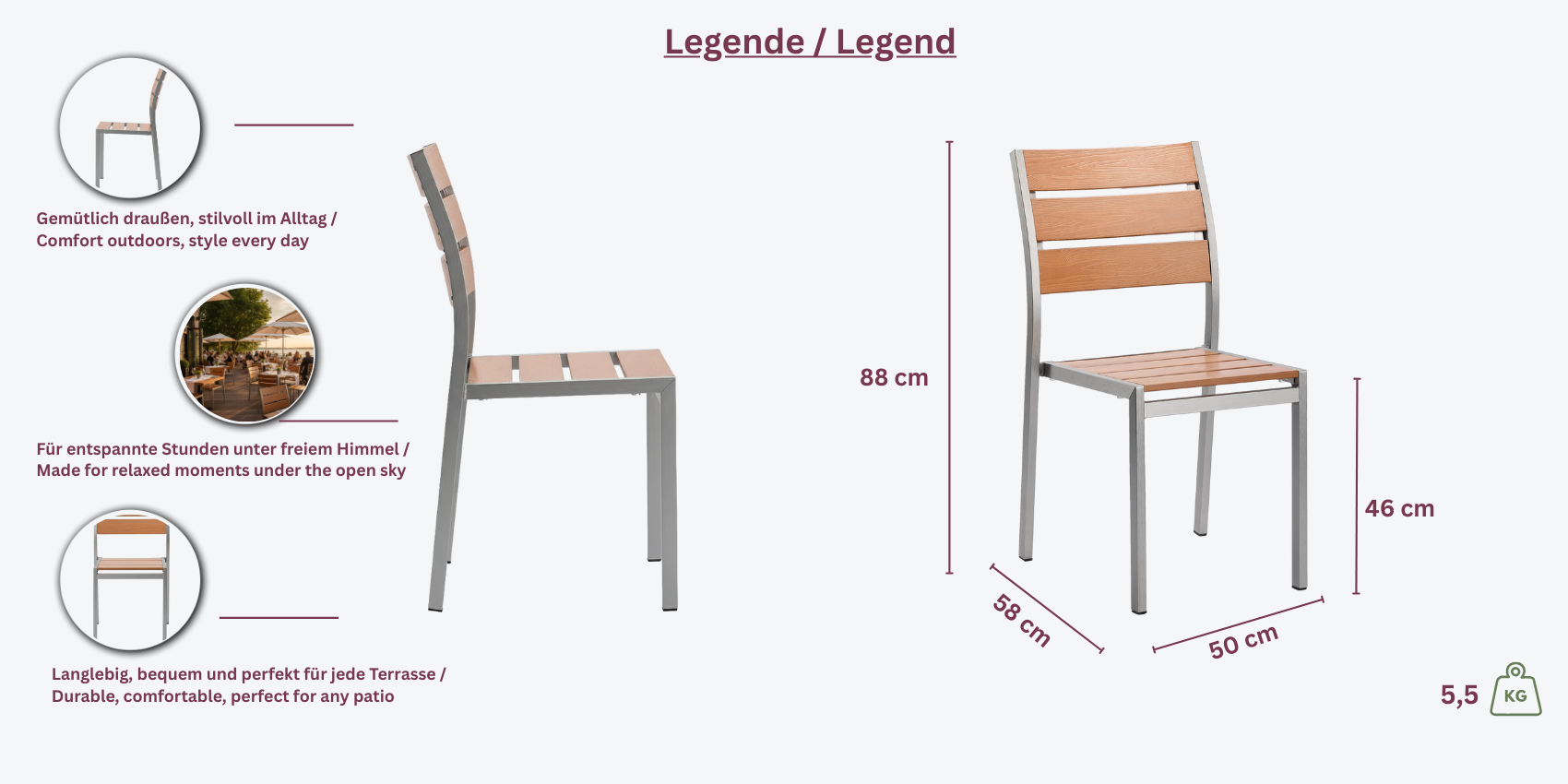 - Sitzfläche: Polywood-Lattung in Teakoptik.