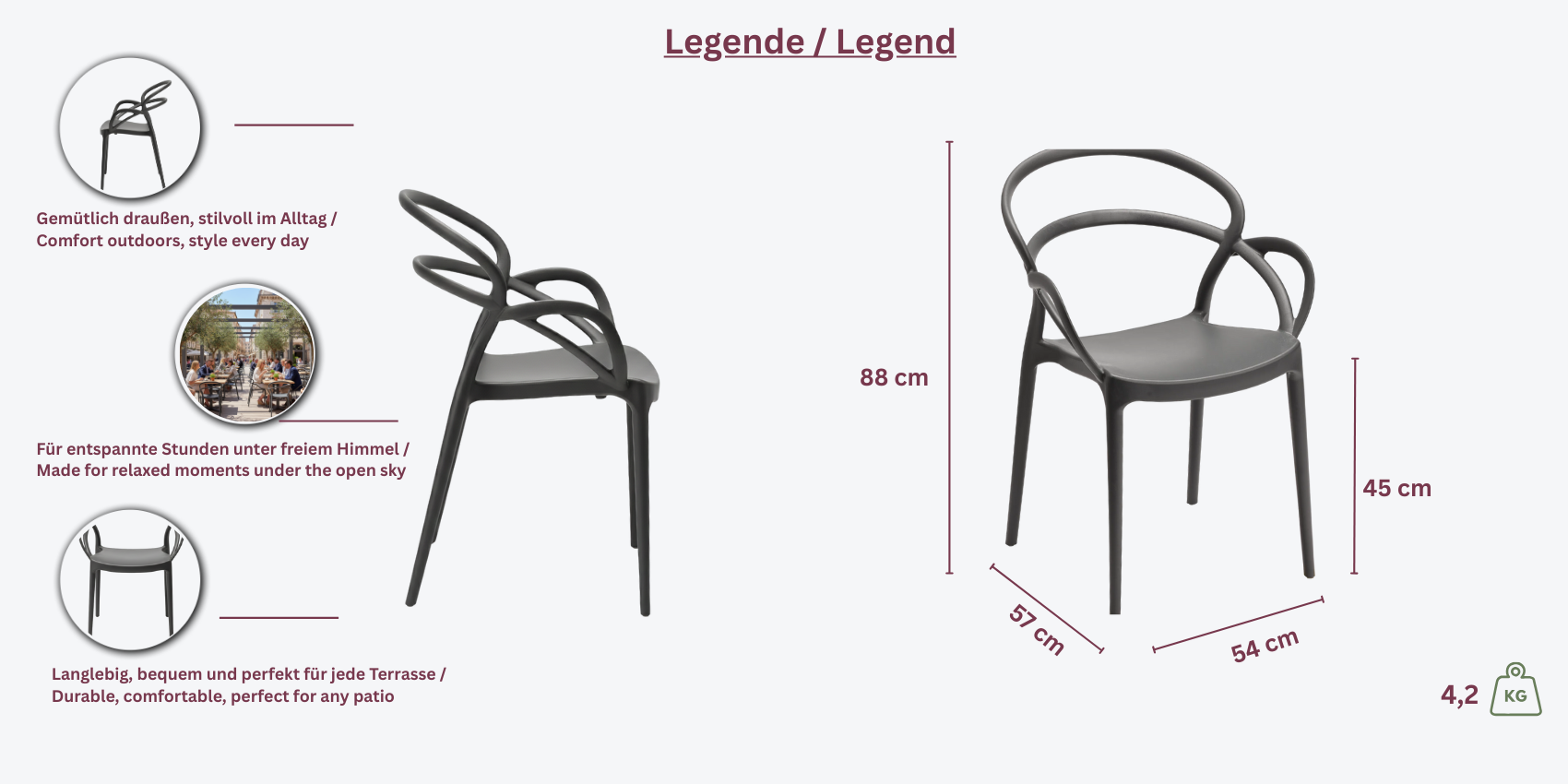 Der Nora Stapelstuhl ist die perfekte Kombination aus modernem Design, Komfort und Funktionalit. Mit seiner klaren Linienfrung und eleganten Form ft sich dieser Stuhl harmonisch in jede Terrasse, jeden Garten oder Balkon ein und verleiht Ihrem Aunbereich eine stilvolle Note.