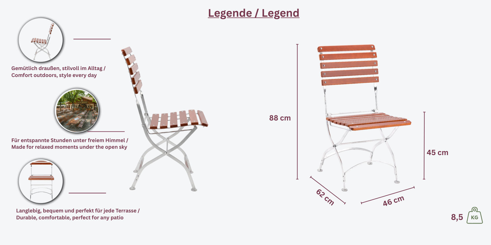 Der Garden Emotions Biergartenstuhl Oberstaufen macht Ihren Garten attraktiver. Mit seinen geschwungenen Beinen wirkt er sehr elegant und sieht einfach großartig aus. Das Gestell besteht aus Flachstahl und ist feuerverzinkt oder pulverbeschichtet in Grün oder Schwarz erhältlich. Der Sitz besteht aus Eschenholzlattung, die mehrfach dickschichtig lasiert wurde. Dieser Stuhl ist in den Farben Kastanie, Nussbaum oder Kiefer lieferbar – die abgebildete Farbe ist Kastanie. Der Stuhl ist klappbar und zudem UV- und wetterbeständig.