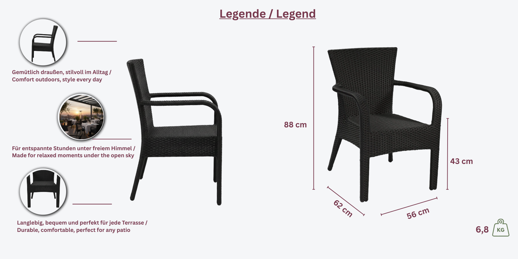 Der Terrassenstuhl Porto bietet eine gelungene Kombination aus thetischem Design und praktischer Funktionalit und ist eine ausgezeichnete Wahl, um Ihren Aunbereich funktional und stilvoll zu gestalten.