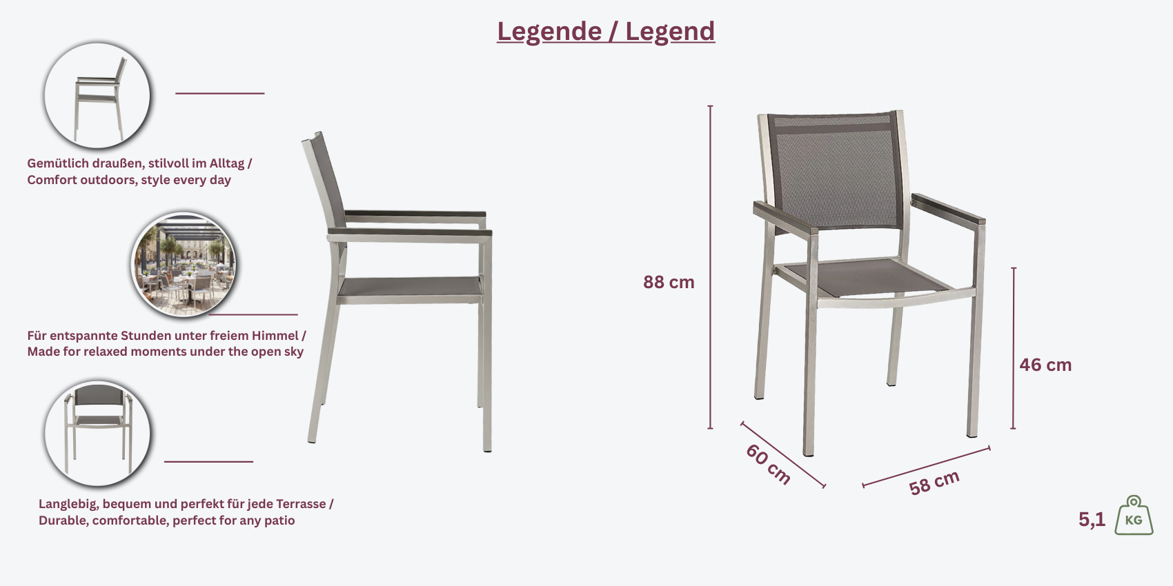 Besonders praktisch ist die Stapelbarkeit des Stuhls, die eine platzsparende Aufbewahrung ermlicht, wenn er nicht genutzt wird. Dies macht ihn ideal f den Einsatz in gastronomischen Betrieben oder f grere Zusammenkfte im Freien.