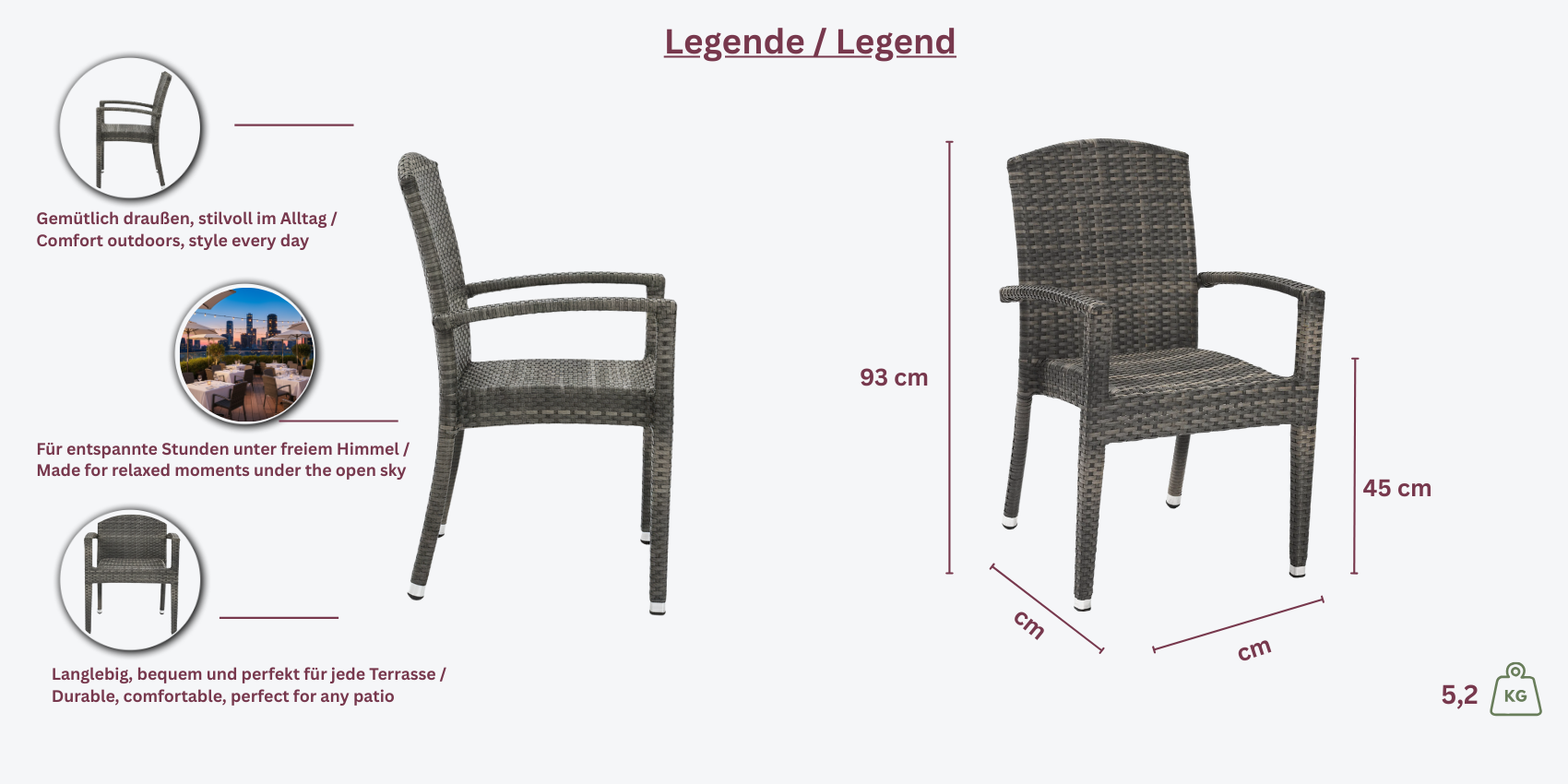 Der Stapelsessel Titan kombiniert modernes Design mit herausragender Funktionalit und ist eine exzellente Wahl f Ihre Terrasse, Ihren Garten oder Balkon. Mit seiner robusten und stilvollen Bauweise bringt dieser Sessel sowohl Eleganz als auch Komfort in Ihren Aunbereich.