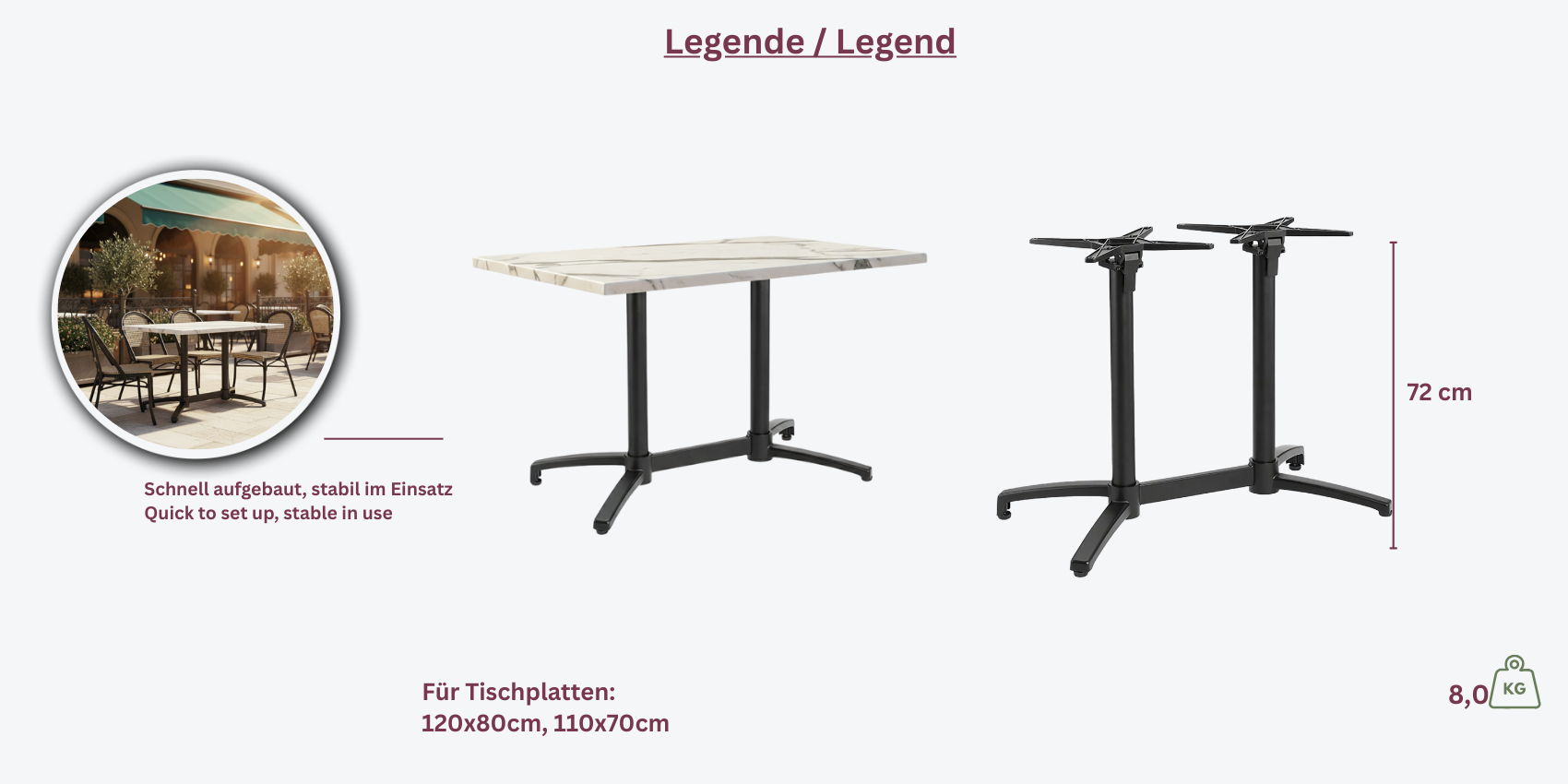 Das **Baltrum Double** Tischgestell ist aus hochwertigem, pulverbeschichtetem Aluminium in Schwarz gefertigt und verfügt über einen praktischen Klappmechanismus. Die zusätzlichen Gewichte sorgen für zusätzliche Stabilität, während das klappbare Design eine einfache Handhabung und Lagerung ermöglicht.