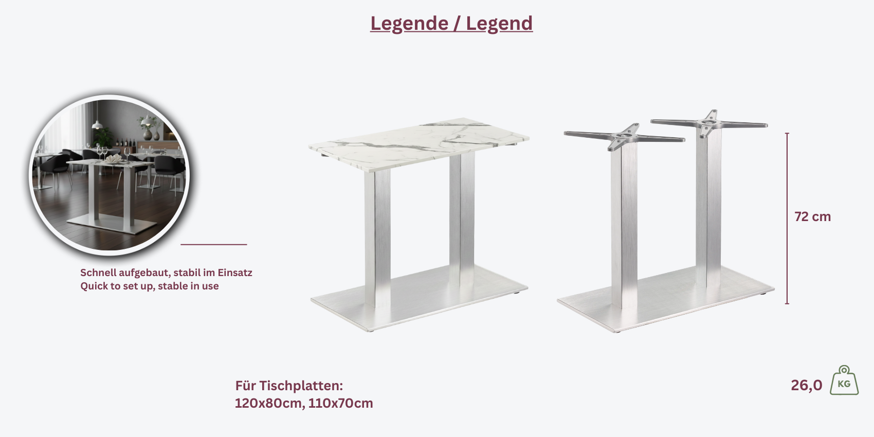 Das Tischgestell Borkum double brushed besteht aus gebürstetem Aluminium, das für seine Langlebigkeit und eleganten Look bekannt ist. Mit einer Höhe von 72 cm ist es ideal für größere Tischplatten und verleiht jedem Raum eine moderne Note.