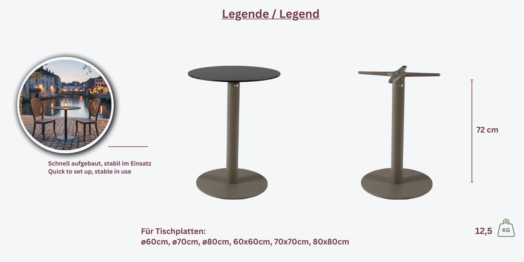 Das Tischgestell Borkum rund besteht aus robustem Aluminium, das pulverbeschichtet ist, um eine widerstandsfähige und pflegeleichte Oberfläche zu gewährleisten. Mit seiner Höhe von 72 cm ist es ideal für verschiedene Tischplatten geeignet.