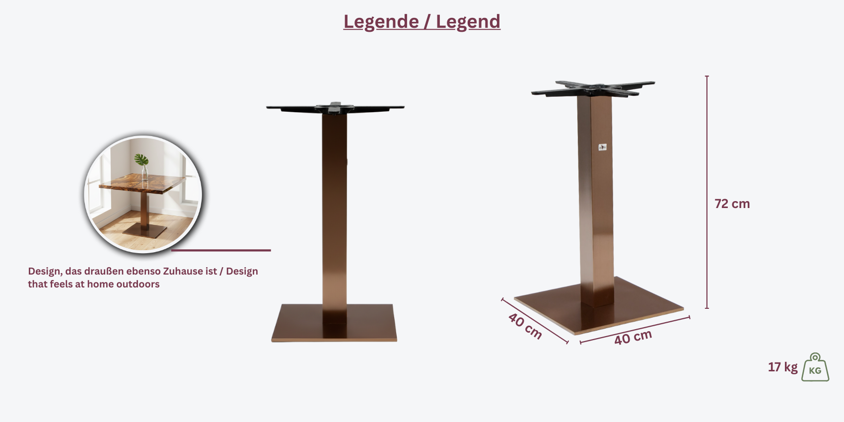 Das Bison Tischgestell CO-04040 ist eine elegante und stabile Basis für verschiedene Tischplatten. Gefertigt aus hochwertigem Edelstahl mit einer edlen Kupferbeschichtung, bietet es sowohl Stil als auch Langlebigkeit für Ihren Tisch.