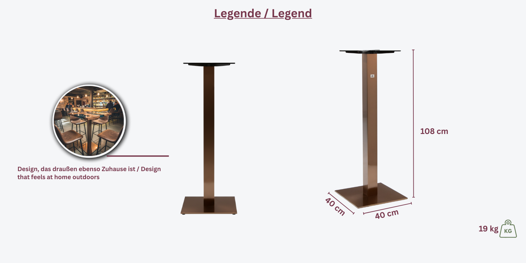 Das CO-04040H Tischgestell ist mit einer Höhe von 108 cm besonders geeignet für höhere Tische oder Stehtische. Seine elegante Kupferbeschichtung und die robuste Edelstahl-Konstruktion machen es zu einem vielseitigen Möbelstück für gastronomische und andere anspruchsvolle Umgebungen.
