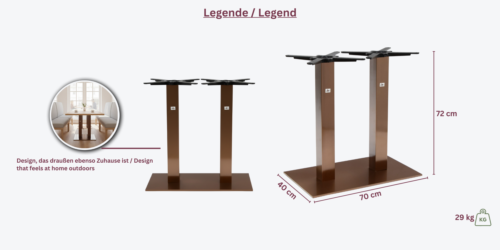 Das Bison Tischgestell CO-04070 verbindet hochwertige Materialien mit einem zeitlosen Design. Mit seiner Kupfer-Oberfläche und der robusten Edelstahl-Konstruktion ist es ideal für verschiedene Tischplatten und verleiht jedem Raum eine elegante Note.