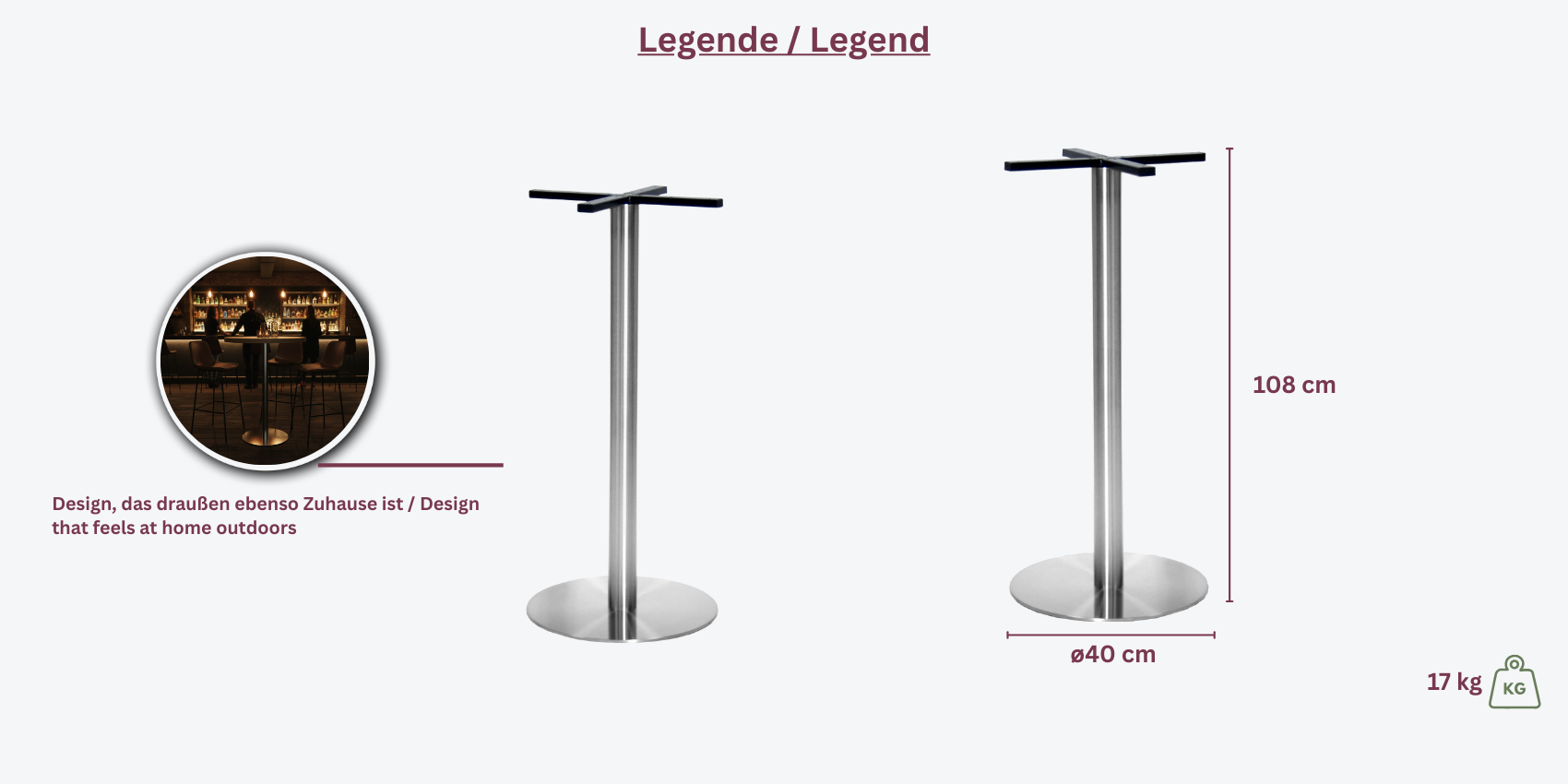 Dieses Tischgestell besteht aus gebürstetem Edelstahl mit einer Bodenplatte von ø 45 cm. Die Höhe von 108 cm ist optimal für verschiedene Tischplatten und sorgt für eine moderne und elegante Optik.