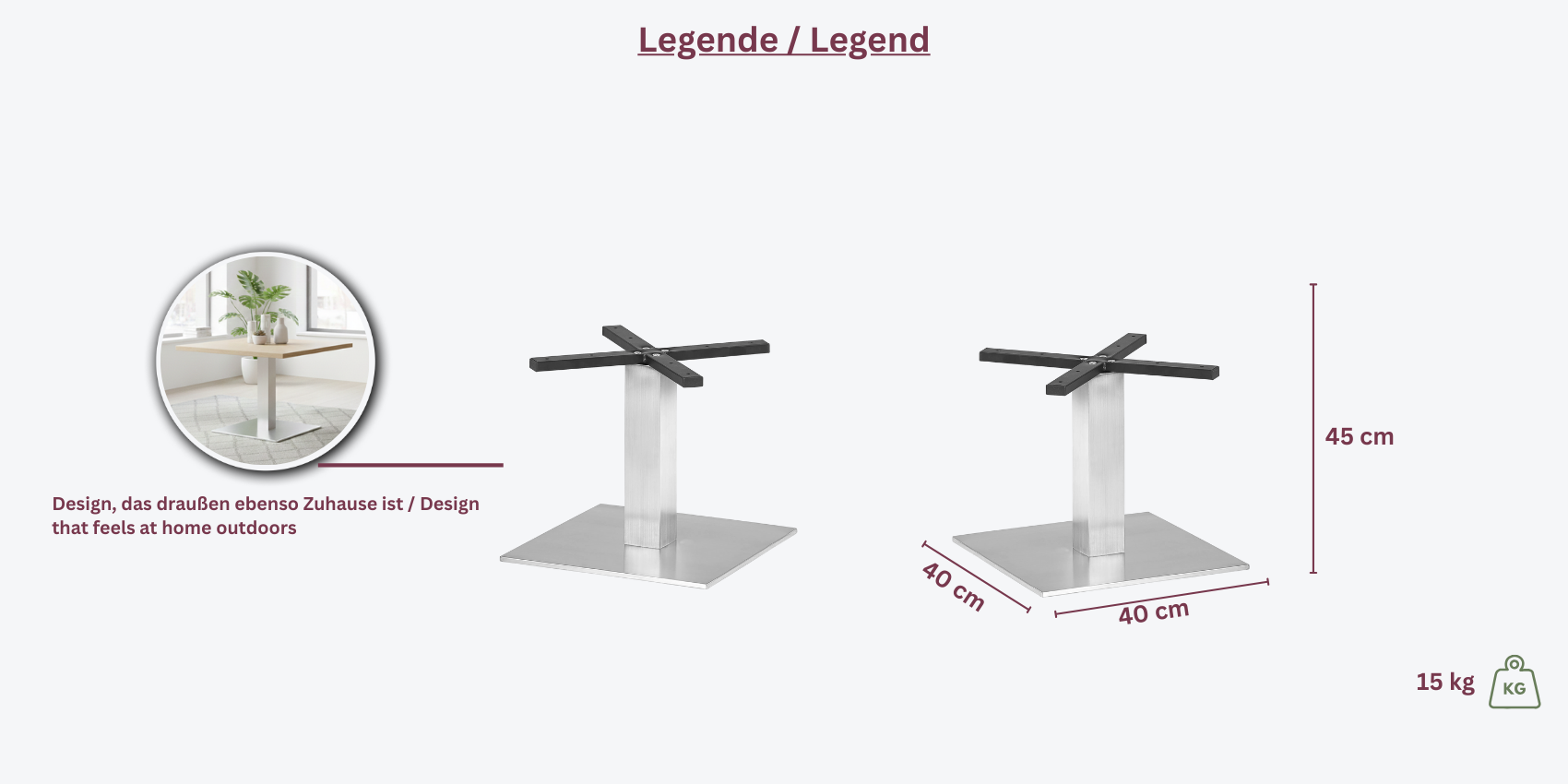 Dieses Tischgestell bietet eine robuste Bauweise und eine ansprechende Optik durch die gebürstete Edelstahl-Oberfläche. Mit seiner niedrigen Höhe ist es besonders geeignet für Tische, die eine geringe Arbeitshöhe erfordern oder für spezielle Anwendungen.
