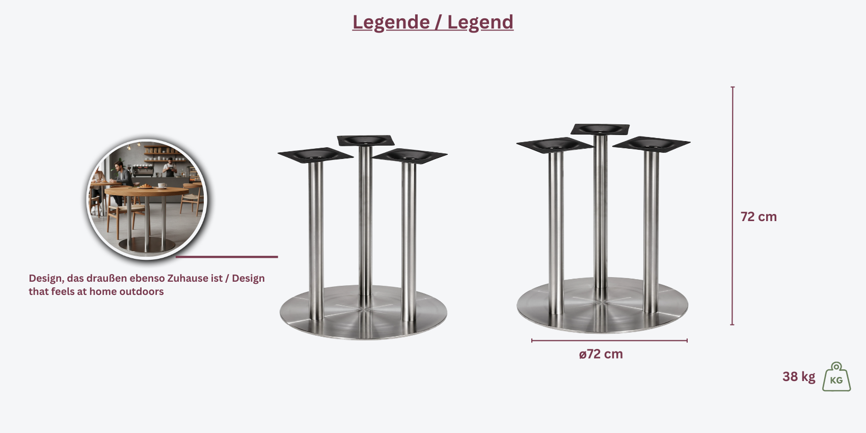 Dieses Tischgestell zeichnet sich durch seine flache, runde Bodenplatte mit einem Durchmesser von 72 cm aus, die aus gebürstetem Edelstahl gefertigt ist. Die drei Säulen sorgen für eine gleichmäßige Verteilung des Gewichts und bieten zusätzliche Stabilität, ideal für große Tischplatten bis zu einem Durchmesser von 150 cm.