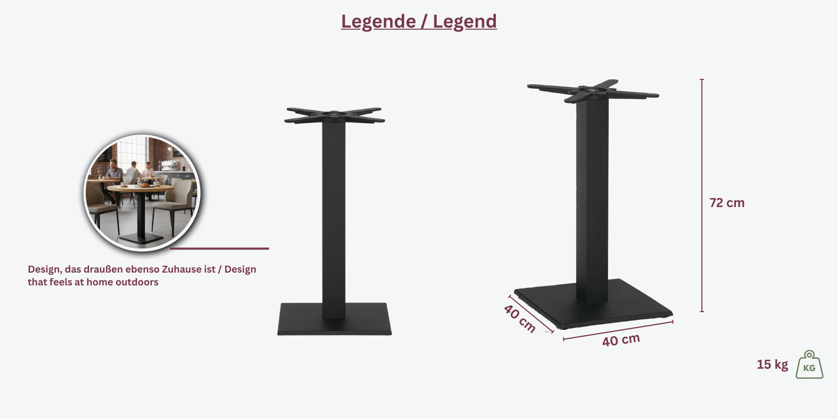 Das Tischgestell F-04040 überzeugt durch seine Stabilität und Langlebigkeit. Die flache Bodenplatte bietet eine solide Grundlage für verschiedene Tischplatten, während das Gusseisen für eine klassische und elegante Optik sorgt.