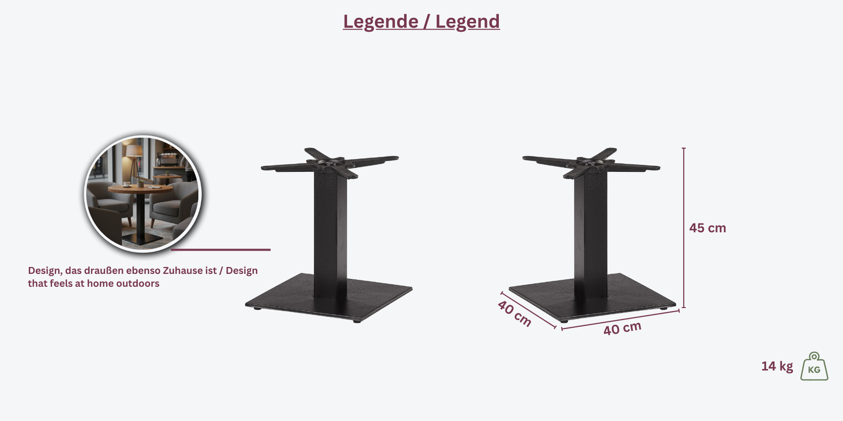 Das Tischgestell F-04040L besteht aus hochwertigem Gusseisen mit einer Bodenplatte von 40x40 cm. Die Höhe von 45 cm macht es besonders geeignet für Tische, bei denen eine niedrigere Höhe erforderlich ist.