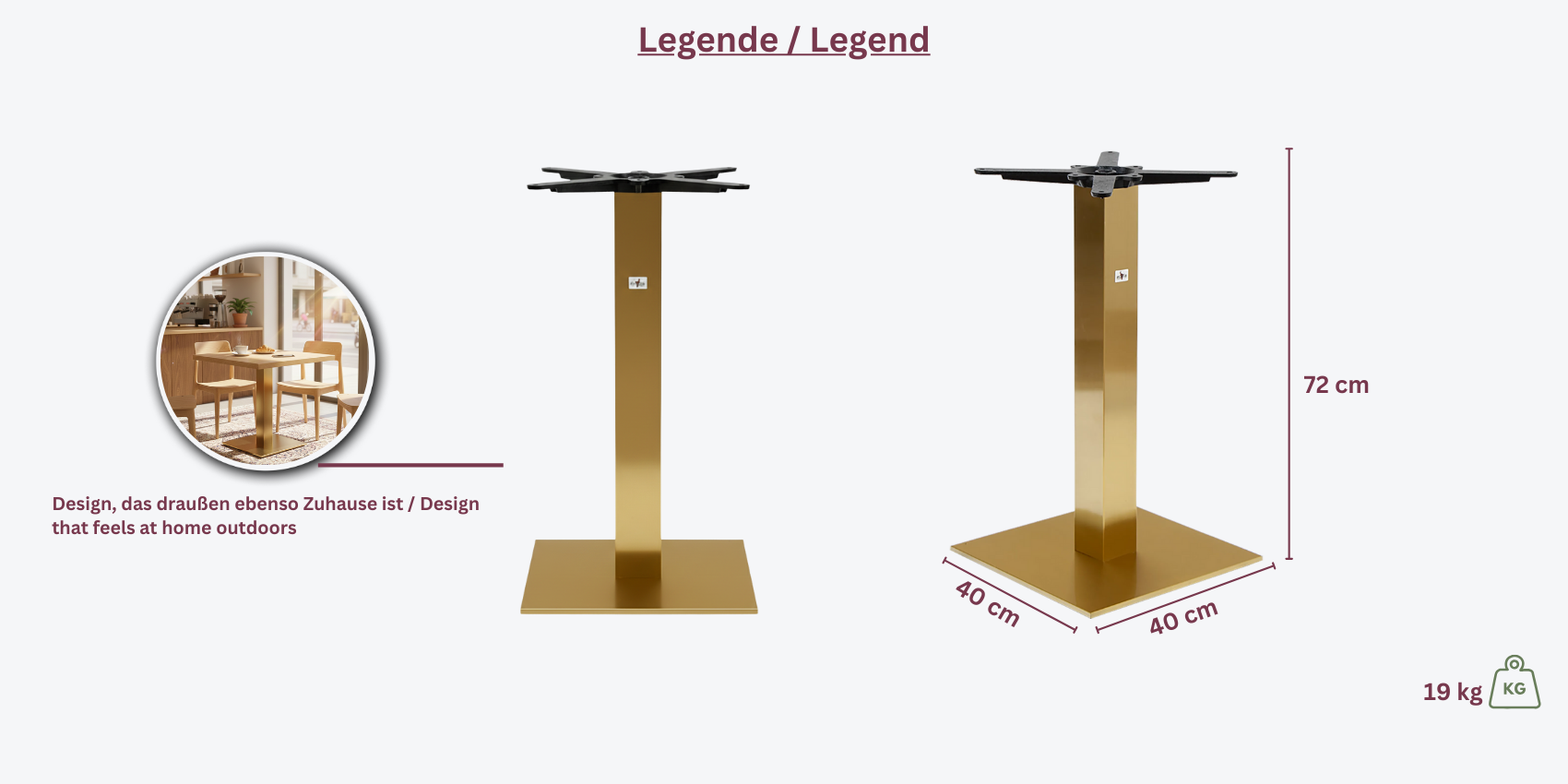 Das G-04040 Tischgestell ist 72 cm hoch und bietet eine stabile Basis für verschiedene Tischplatten. Die goldene Edelstahl-Oberfläche sorgt für einen luxuriösen Look, der sich nahtlos in moderne und klassische Innenräume einfügt.
