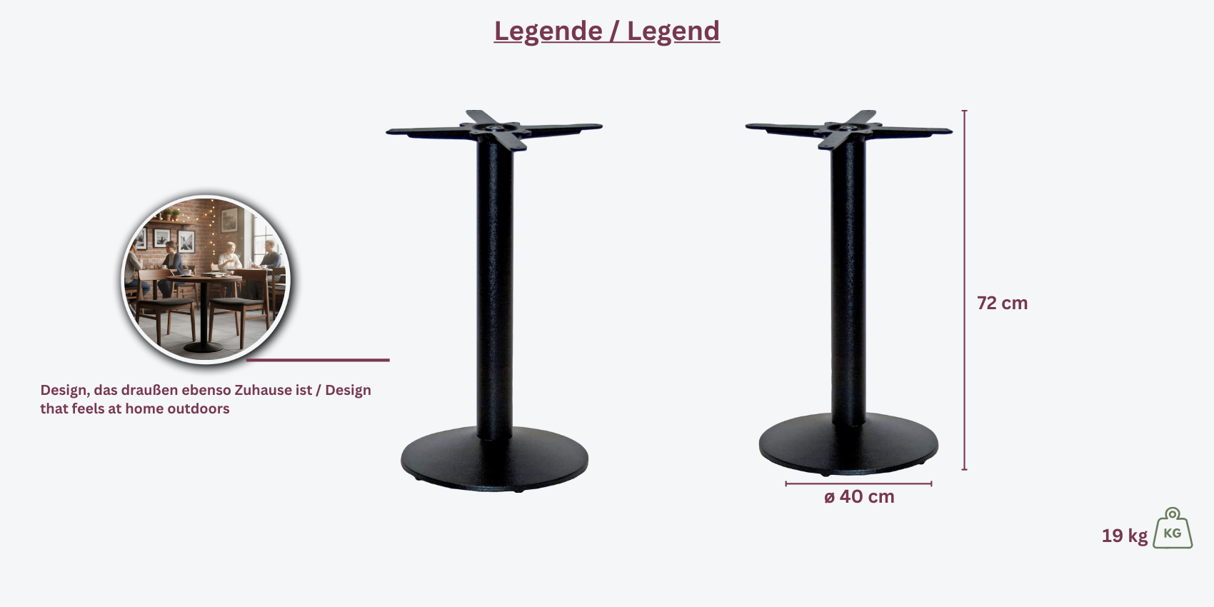 Das Tischgestell K-04000 zeichnet sich durch seine runde, konisch geformte Bodenplatte mit einem Durchmesser von 43 cm aus. Die solide Konstruktion aus Gusseisen gewährleistet Langlebigkeit und Stabilität, während die Standardhöhe von 72 cm es für eine Vielzahl von Tischplattengrößen geeignet macht.