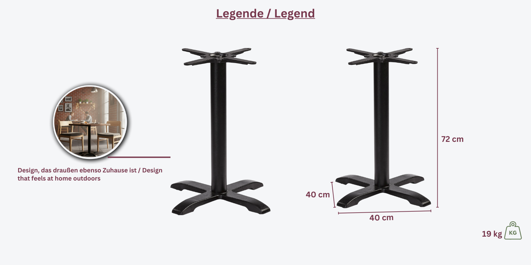 Dieses Tischgestell aus Gusseisen verfügt über einen stabilen Kreuzfuß und vier Einstellfüße, die eine exakte Anpassung der Höhe ermöglichen. Die Höhe des Gestells beträgt 72 cm, was es für eine Vielzahl von Tischplattengrößen geeignet macht.