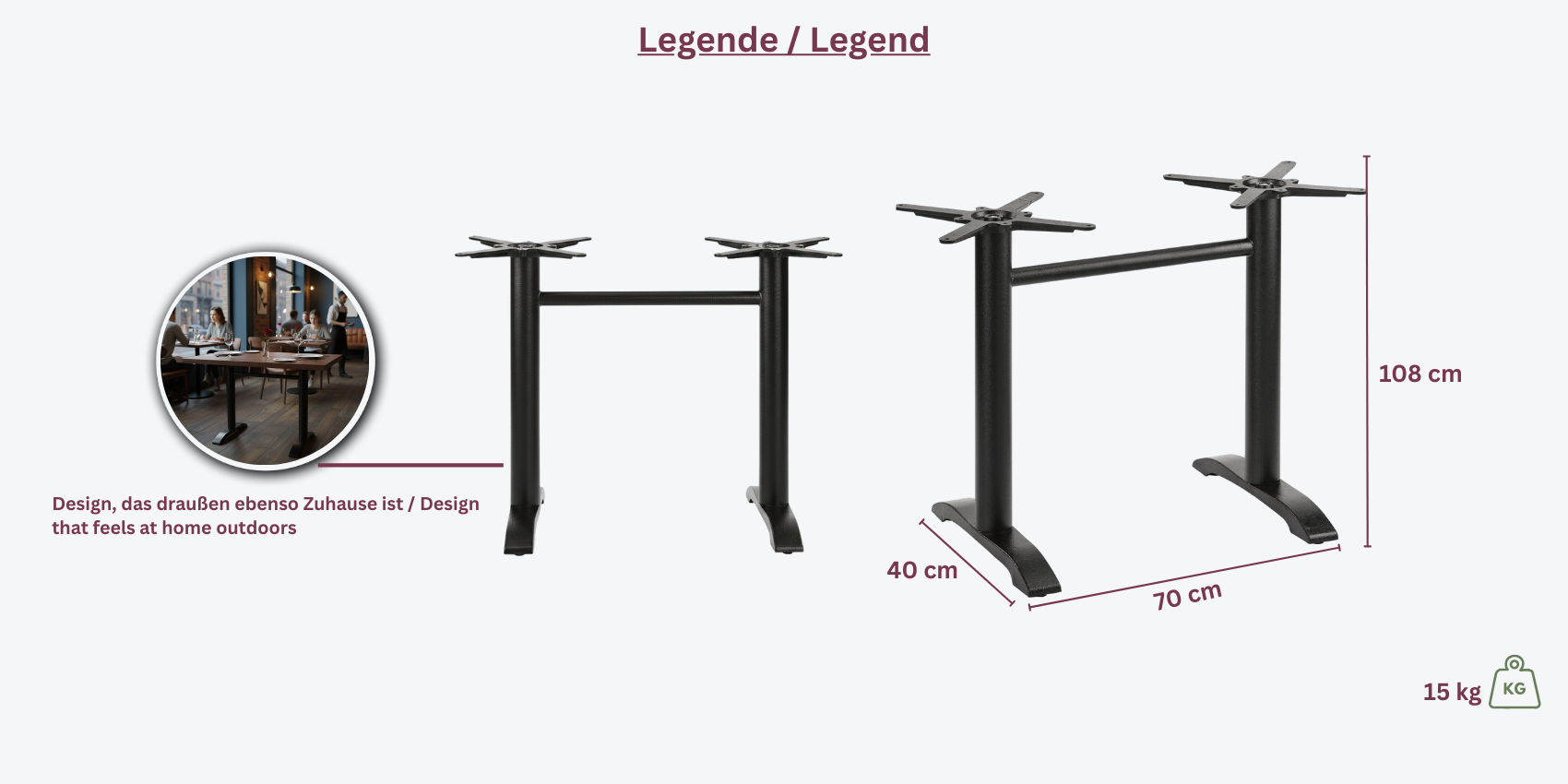 Dieses Tischgestell aus Gusseisen hat einen stabilen Kreuzfuß und vier Einstellfüße für präzise Höhenanpassungen. Die Höhe des Gestells beträgt 108 cm, was es für Stehtische und andere höhenverstellbare Tischanwendungen geeignet macht.