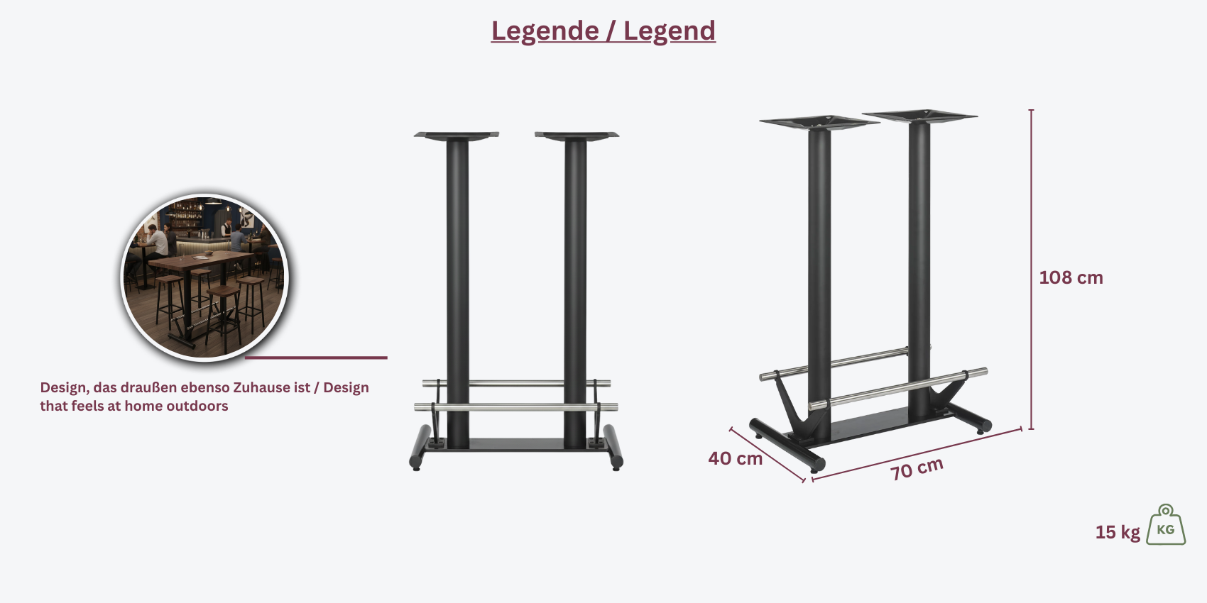 Dieses Tischgestell ist aus hochwertigem Stahl gefertigt und schwarz pulverbeschichtet. Es ist mit einer Bodenplatte ausgestattet und hat Fußrasten aus Edelstahl, die für zusätzliche Stabilität sorgen.