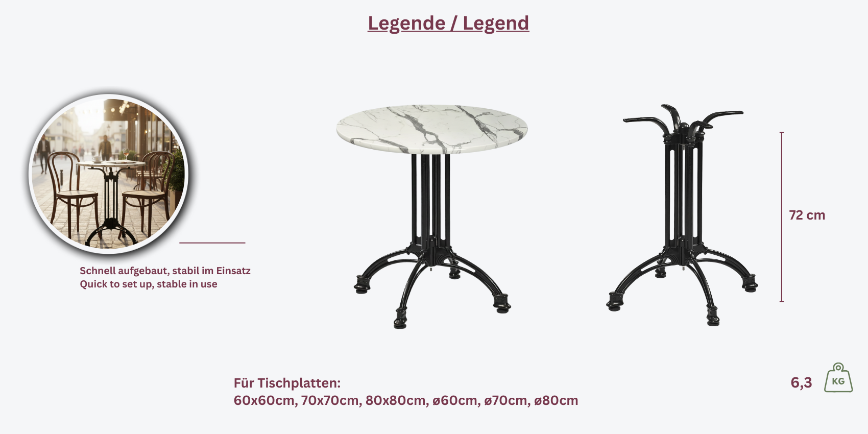 Das **Sylt 4** Tischgestell besteht aus hochwertigem Gussaluminium, das in Schwarz pulverbeschichtet ist. Es hat eine Höhe von 72 cm und ist für verschiedene Tischplattengrößen geeignet, was es zu einer flexiblen Wahl für Ihr Zuhause oder Ihr Geschäft macht.