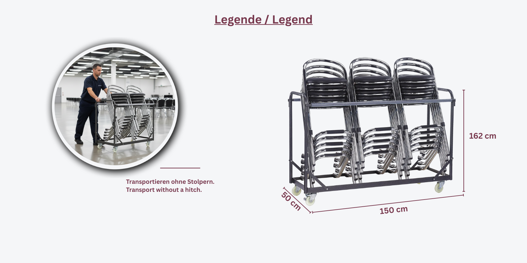 Der Stuhlwagen Trolley-C / 40-L ermöglicht den einfachen Transport und die Aufbewahrung von Stühlen, mit einem großzügigen Ladevolumen:
