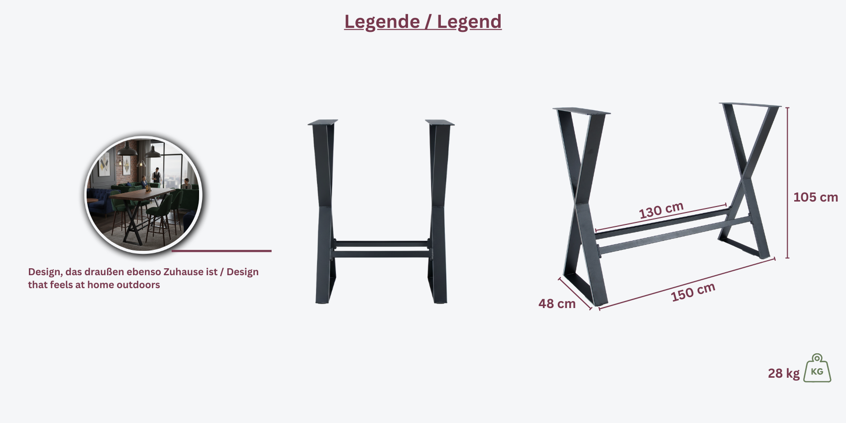 Das Stehtischgestell X-Bar ist in einem eleganten Schwarz pulverbeschichtet. Es verfügt über eine Querstrebe mit einer Länge von 130 cm, die für zusätzliche Stabilität sorgt und als Fußablage dient. Es ist speziell für Tischplatten ab einer Länge von 160 cm konzipiert.