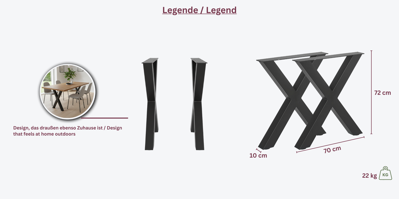 Das X-Gestell eignet sich hervorragend für moderne und zeitgemäße Tischgestaltungen. Es kann in Büros, Konferenzräumen, Cafés oder Wohnräumen verwendet werden, um einen eleganten und stabilen Tisch zu erstellen.
